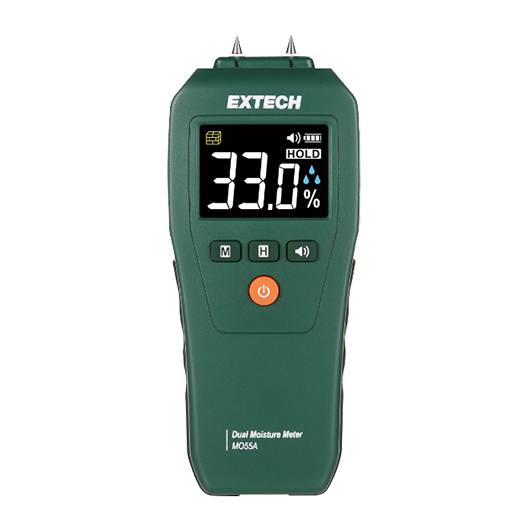 Miernik wilgotności Extech MO55A umożliwia szybki pomiar wilgotności w różnych materiałach budowlanych, zarówno metodą kontaktową z użyciem elektrod, jak i bezkontaktową (nieinwazyjną). Urządzenie jest łatwe w obsłudze i zostało wyposażone w czytelny, kolorowy wyświetlacz LCD z podświetleniem, który zapewnia dobrą widoczność w każdych warunkach.